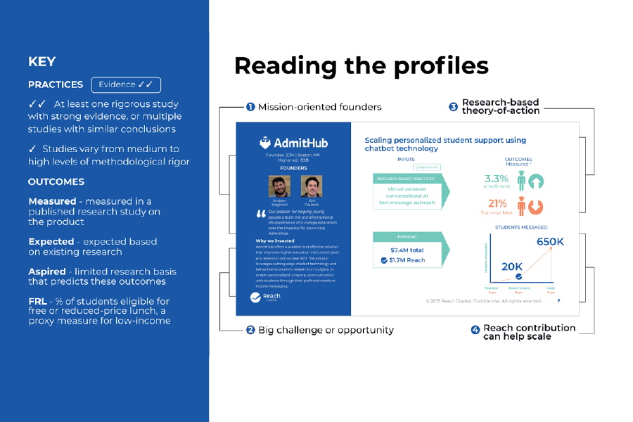 Reach Capital invests in early-stage edtech companies. As impact investors, we look for investment opportunities where impact, scale and financial returns are positively correlated: the greater the impact, the greater the adoption, and (with solid unit economics) the greater the financial returns.