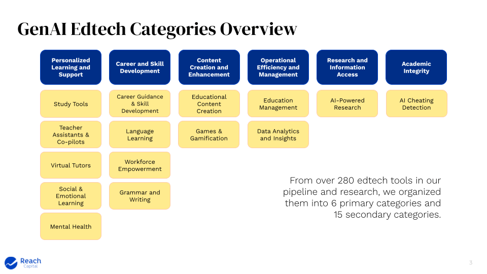 In any case, AI in education is not a new trend. When Reach started in 2015, we met a number of companies taking advantage of cutting-edge advancements at the time, in image recognition, natural language processing, voice recognition and machine learning. We invested in these categories through companies like: