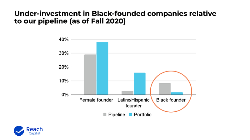 Over the summer of 2020, in the aftermath of the murder of George Floyd, we realized that our “underrepresented minority” category was too blunt and that we needed to disaggregate our data by race. The more precise look at our data forced us to face a stark reality: In five years of investing in 63 companies, we had only invested in one company with a Black founder.